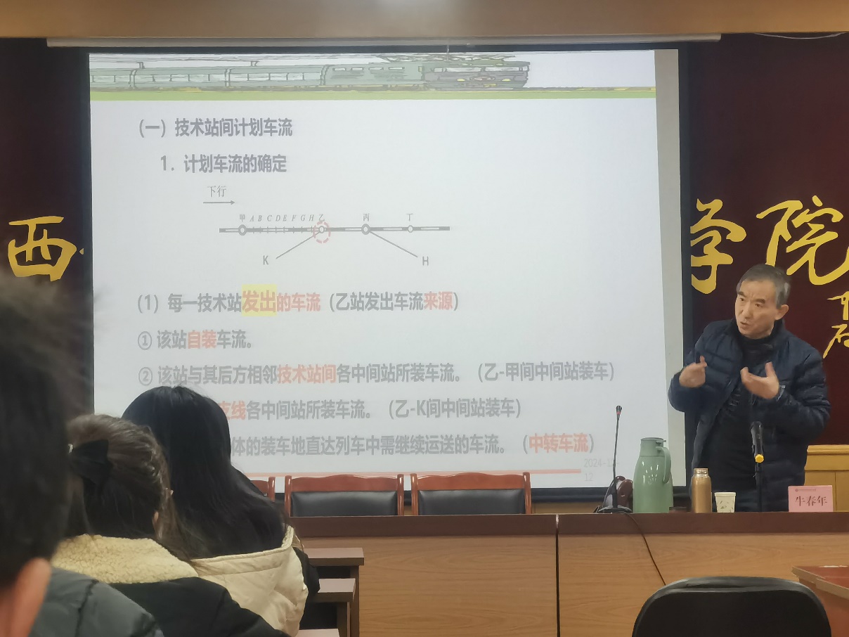 2024年12月12日下午,交通运营系邀请大秦铁路股份有限公司太原职工培训基地正高级工程师牛春年,在学院多媒体二层,做了题为“车站行车组织解析——以列车调度指挥为例”专题讲座。讲座由系主任赵爱威主持,交通运营系铁道运输类专业教师参加。讲座时长长达3个多小时。讲座后,大家就相关内容进行了交流研讨。