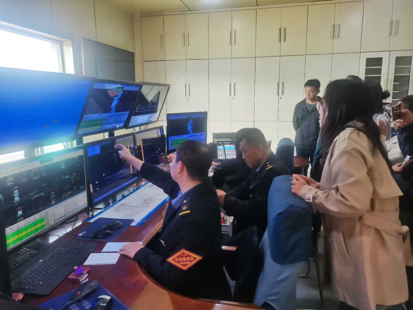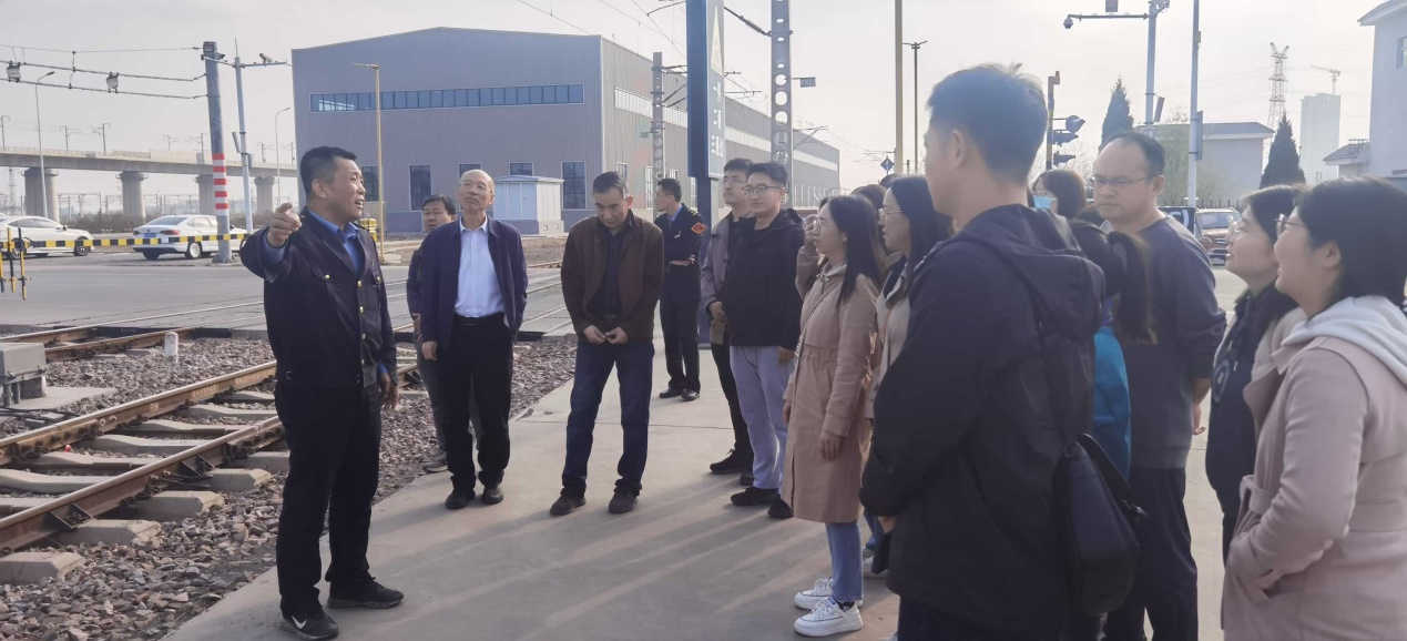 随后,参观了中鼎物流园站行车室。中鼎物流园站是山西省中欧中亚班列的始发站,货运繁忙。在行车室内,交通运营系教师们了解了TMS系统的功能和操作方法,与行车值班员和助理值班员就工作内容及操作规范进行了交流。
